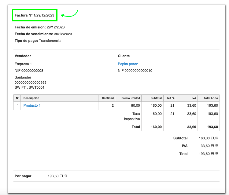 El formato de numeración aceptado es nr-m/dd/mm/yyyy. Para un documento emitido el 29 de diciembre de 2023, con la opción de Usar siempre el formato del día de dos cifras el valor del día se mostrará como 1/29/12/2023.