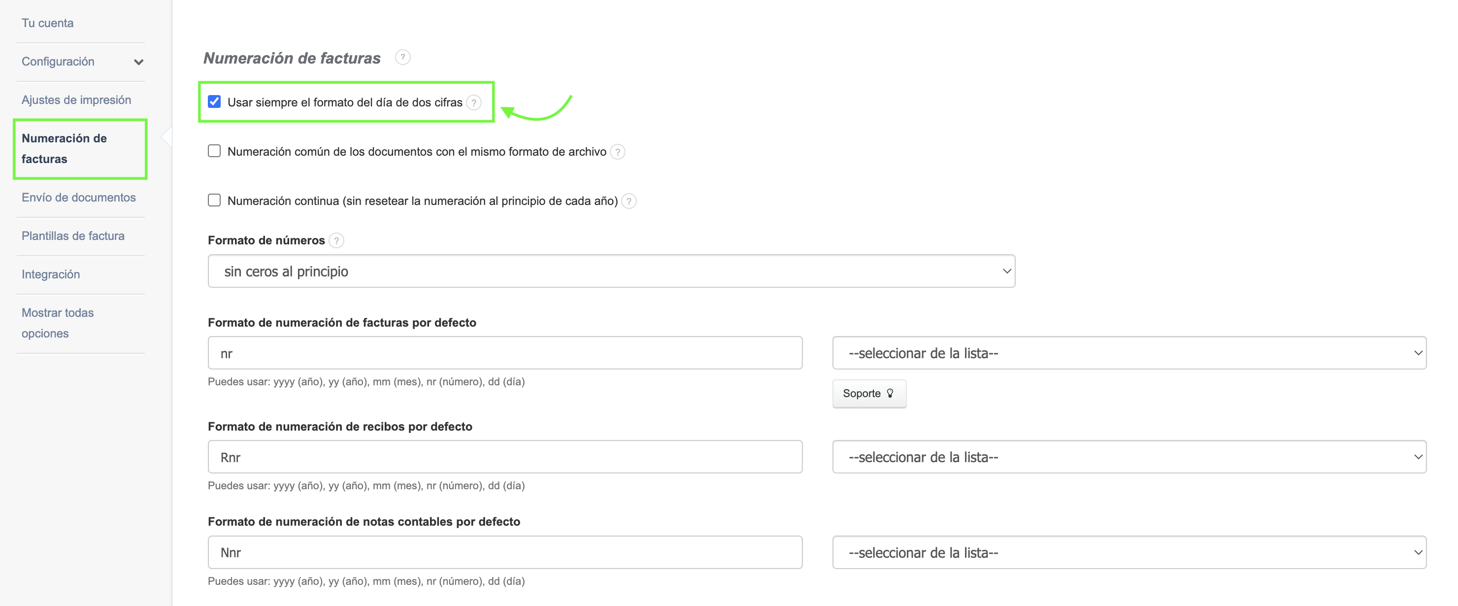 BitFactura permite definir varios formatos de numeración de documentos. Una de las variables que se pueden utilizar es la variable 'dd', responsable de indicar el día del mes. Por defecto, el sistema registra el número del día como un valor de una sola cifra. Si deseas que el formato de numeración siempre incluya un valor de dos cifras, debes activar esta configuración en el sistema. En este texto aprenderás dónde habilitar el formato de dos cifras para el número del día. ¡Atención!: Este formato no es recomendable para cuentas que emitan facturas para España o en España ya que la normativa española requiere una numeración de facturas secuencial, única y continua sin reinicio por fecha o formato.