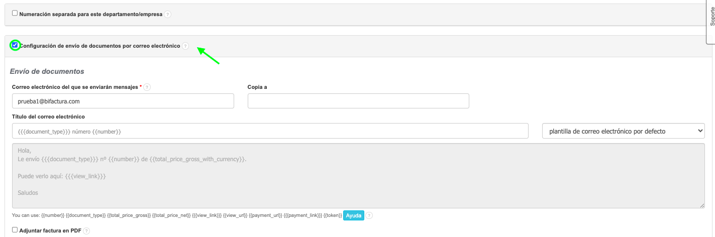 - Marca la casilla Configuración de envío de documentos por correo electrónico;