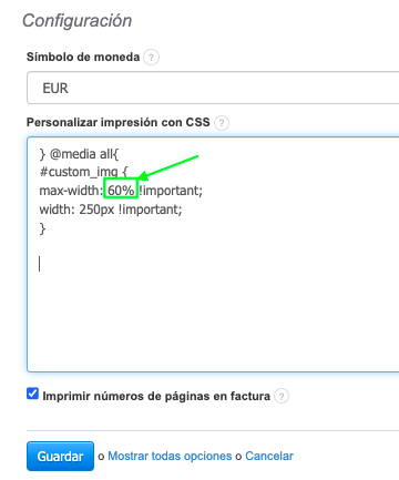 - En el campo Personalizar impresión con CSS, reduce o aumenta el porcentaje