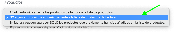 - Marca la opción NO adjuntar productos automáticamente a la lista de productos de factura.