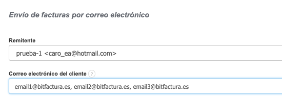 Para añadir varios correos electrónicos a los que debería llegar una factura hay que en el campo de destinatario introducir los correos separados por coma, por ejemplo: email1@nombre.es, email2@nombre.es.