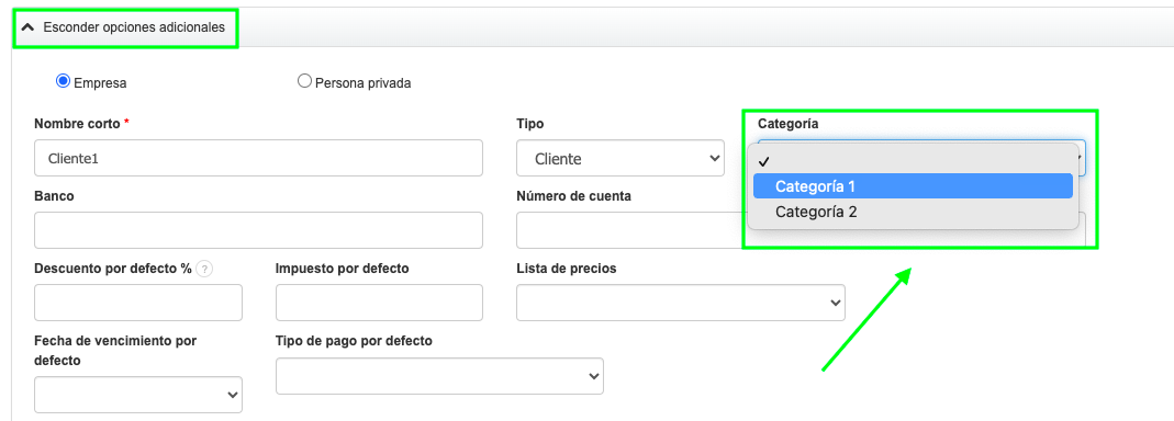 - Asegúrate de haber creado previamente las categorías relevantes a las cuales puedes asignar tus clientes (si no lo has hecho, ve a Ajustes > Categorías de ingresos/costos > Añadir).