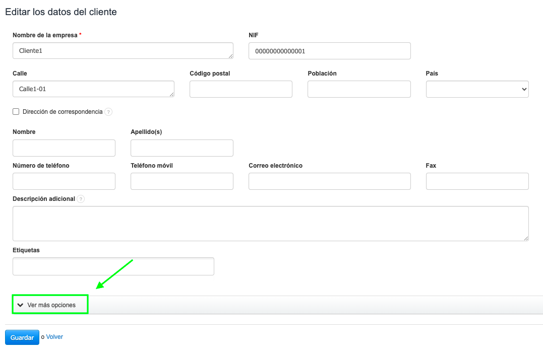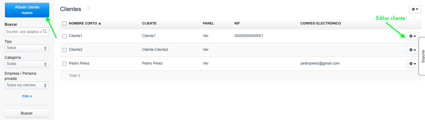 Para asignar un impuesto por defecto a un cliente, selecciona la pestaña Clientes desde el menú superior. Dependiendo de tus necesidades, elige el cliente previamente creado (rueda dentada a la derecha > Editar) o añade uno nuevo (botón lateral izquierdo Añadir nuevo cliente)
