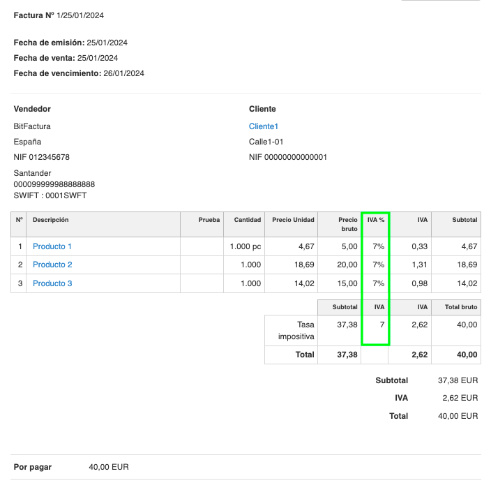 Por ejemplo: si el producto en la tarjeta del producto, tiene una tasa de IVA del 21%, al crear una nueva factura y agregar un cliente con una tasa de IVA del 7%, todos los productos agregados tendrán automáticamente la tasa de impuestos especificada en la tarjeta de ese cliente.