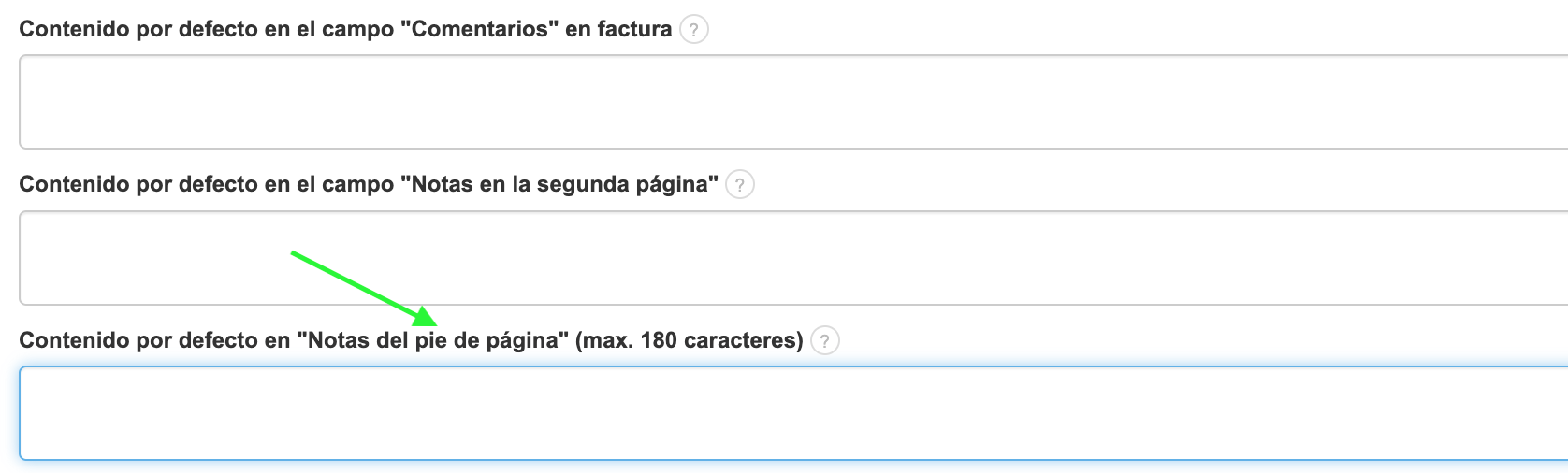 La entrada predeterminada en el pie de página de la factura se puede cambiar en el menú Ajustes > Ajustes de cuenta > Configuración > Campo Contenido por defecto en 'Notas del pie de página'