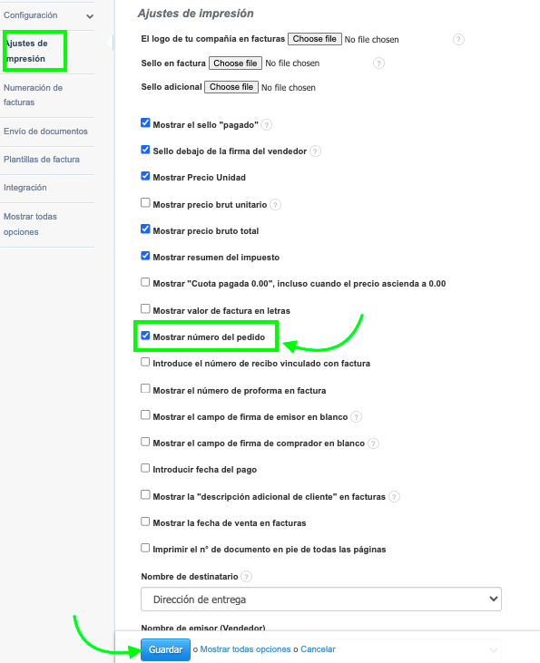 ¿Cómo mostrar el número del pedido en la impresión y el PDF?