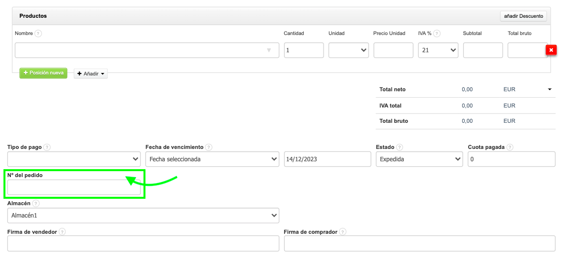 El campo Número del pedido está disponible en el formulario de creación/edición de documentos. Debajo del tipo de pago, encontrarás un campo dedicado para ingresar el Número del pedido. Después de ingresar un valor en este campo, aparecerá en la impresión del documento si la visualización del número del pedido está activa en los ajustes de cuenta.