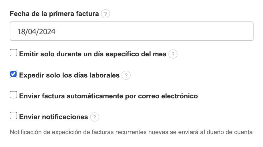Para que las facturas se emitan solamente en los días hábiles hay que emitir nueva factura recurrente. Entra en Facturas (ingresos) > Facturas recurrentes > Nueva factura recurrente y marca la casilla Expedir solo los días laborales. Recuerda marcar la casilla y guardar. Este cambio se aplicará solo a esta factura.
