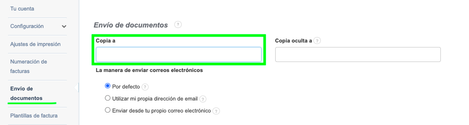 En Ajustes > Ajustes de cuenta > Envío de documentos > Copia a, puedes proporcionar una dirección de correo electrónico en copia predeterminada, que puedes eliminar/modificar para cada envío de documento si es necesario.