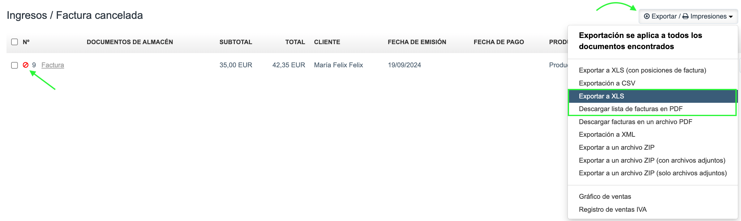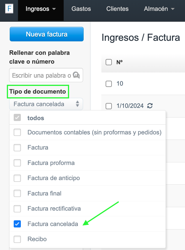 Después de cancelar la factura, la siguiente, tendrá automáticamente el número consecutivo al cancelado (el último cancelado más 1). ¡La cancelación de una factura no se puede deshacer una vez que ha sido confirmada! La factura cancelada será visible al ingresar en la pestaña Ingresos > Todos. Si deseas recopilar las facturas canceladas de un período determinado en una lista, utiliza el filtro lateral Tipo de documento y selecciona Factura cancelada