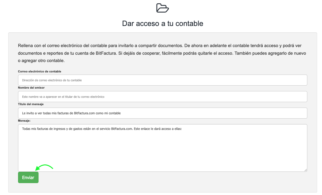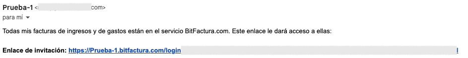 Tu contable recibirá un correo electrónico con un enlace de invitación para iniciar sesión en la cuenta de BitFactura del usuario, en el cual debes hacer clic.