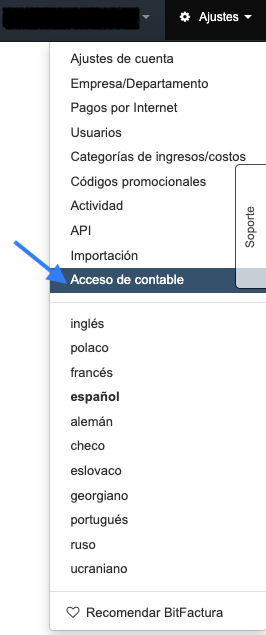Si deseas conceder acceso a tu contable a los documentos necesarios para el ciclo de facturación mensual, selecciona Ajustes > Acceso de contable desde el panel principal de la aplicación BitFactura.