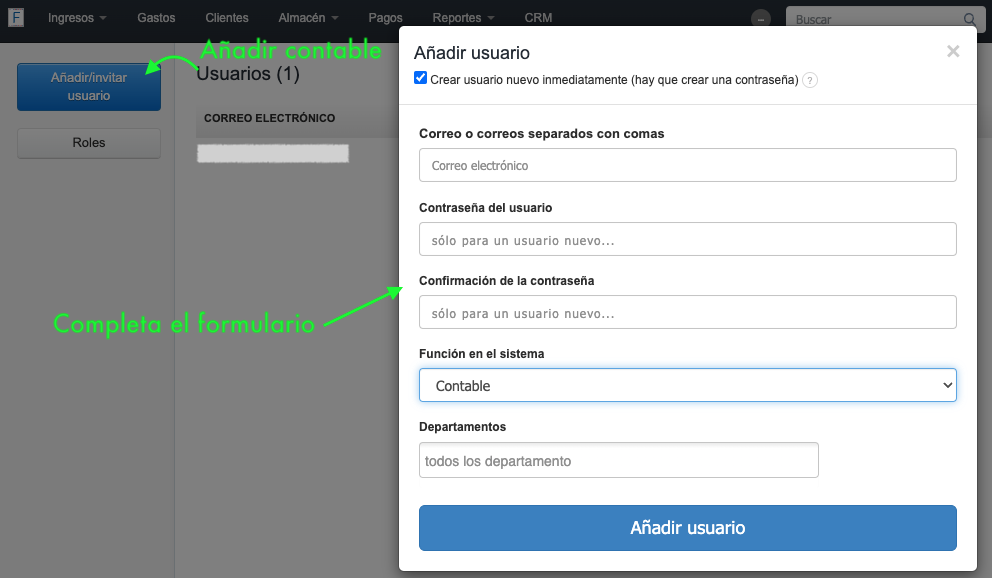 En el campo Añadir usuario, puedes decidir si deseas crear el rol de contable con una contraseña establecida por ti de inmediato o permitirle elegir su propia contraseña.