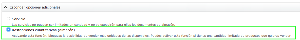 - Al crear un nuevo producto o al editar uno existente en el formulario de creación/edición de productos, ve a la sección Ver más opciones (o Esconder opciones adicionales si ya está expandida) y marca la casilla junto a la opción Restricciones cuantitativas (almacén).