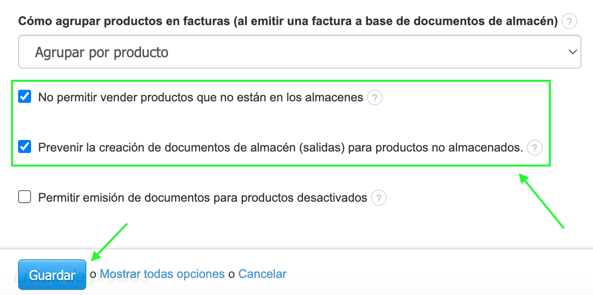 Marca las casillas junto a las opciones deseadas (puedes bloquear la emisión de facturas para productos que no están en el almacén, así como también documentos de almacén (salidas))
