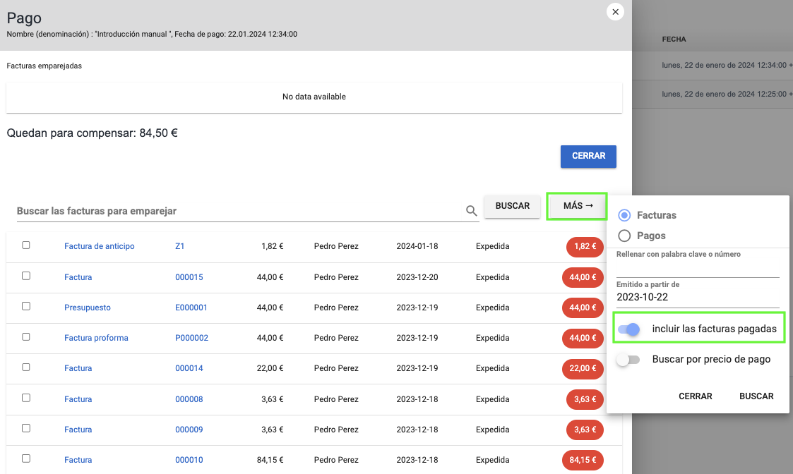 En los ejemplos anteriores, el sistema excluye las facturas pagadas de la lista de sugerencias. La lista incluye facturas impagas o parcialmente pagadas. Sin embargo, si deseas tener la lista completa de facturas, incluidas las pagadas, debes utilizar la opción Más > incluir las facturas pagadas.