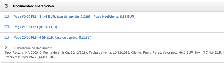 En el caso de vincular un pago y una factura con monedas principales diferentes, en las actividades relacionadas con el documento, debajo de la vista previa de la factura, aparecerá información sobre la tasa de cambio a la que se convirtió el pago. Además, para el último pago agregado en las actividades del documento, habrá información sobre la cantidad de pago excesivo o pago insuficiente si la cantidad del pago no coincide con la cantidad de la factura.