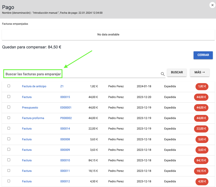 En la parte superior del formulario de pago también hay una herramienta de búsqueda de factura, que te permite especificar manualmente con qué factura debe estar conectado el pago (y no es necesario que coincida la moneda o la cantidad).