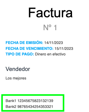 Si deseas agregar más de 1 número de cuenta visible en la factura, debes ingresarlos en un solo campo de cuenta bancaria utilizando el código <br /> entre los números de cuenta de la siguiente manera: <br /> Banco1 12345675823132139 <br /> Banco2 98765434254353321