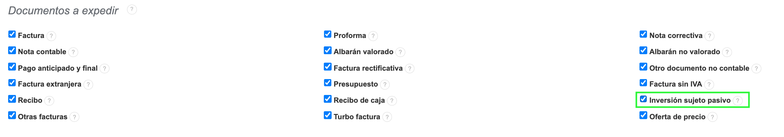 Para utilizar este tipo de documento hay que entrar en Ajustes > Ajustes de cuenta > Tu cuenta > Documentos a expedir y marcar la opción Inversión sujeto pasivo.
