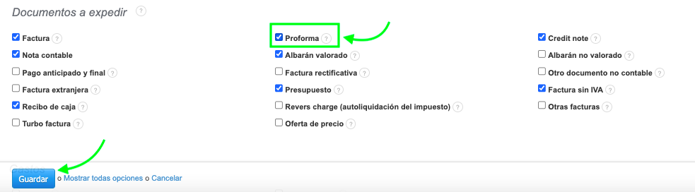Para poder emitir una factura Proforma, es necesario activarla en el sistema. Para hacerlo, vaya a Ajustes > Ajustes de cuenta > Tu cuenta. En la sección Documentos a expedir, marque la casilla junto a la opción Proforma y confirme los cambios con el botón Guardar en la parte inferior de la página. Después de guardar, ya podrá emitir este tipo de documento en el sistema de facturación.La factura Proforma tiene la misma apariencia que una factura tradicional: