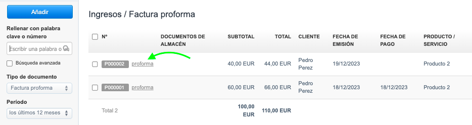 - Accede a la vista previa de la factura proforma haciendo clic en su número. La lista de facturas está disponible al hacer clic en Ingresos > Facturas Proforma