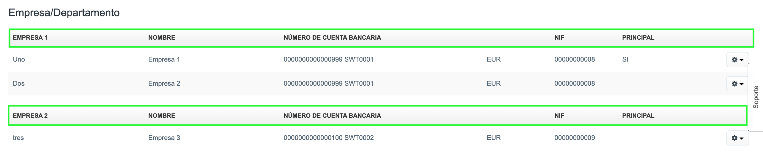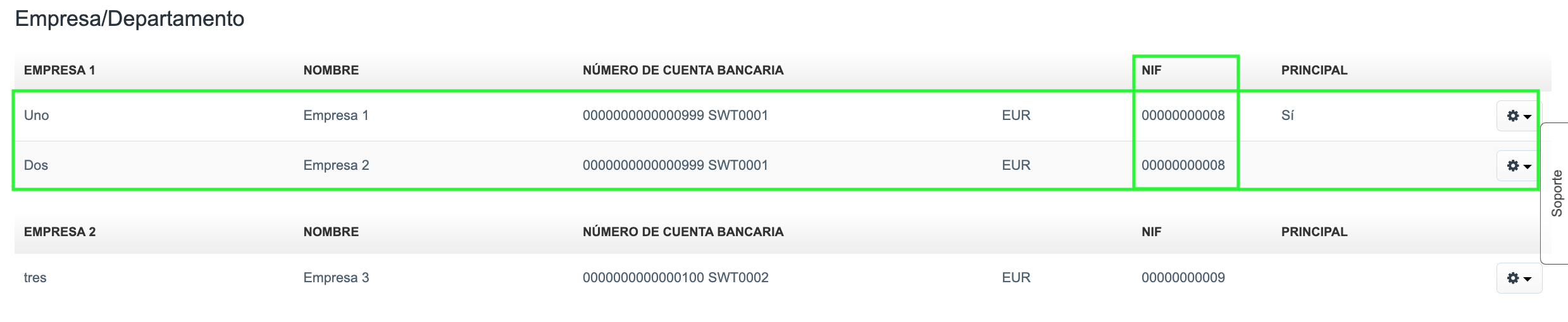 En la pestaña Empresa/Departamento los departamentos se agruparán según su número de NIF.