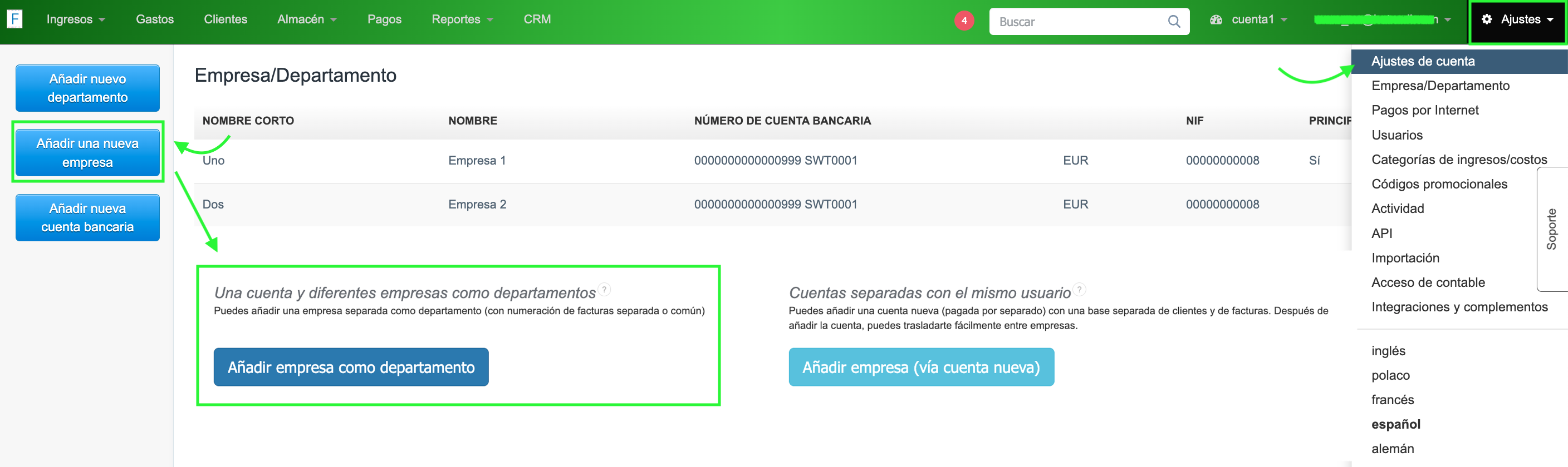 Para añadir un departamento o empresa dentro de una cuenta, ve a Ajustes > Empresa/Departamento. Después de añadir departamentos/empresas, puedes cambiar entre ellos al emitir facturas. Puedes leer más sobre esto en el artículo Cómo cambiar de departamento al emitir facturas.