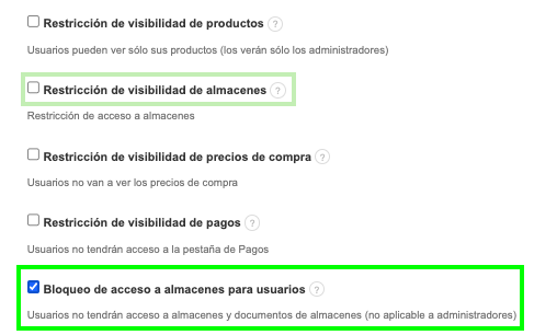 Si deseas permitir que un usuario tenga acceso solo a los almacenes asignados a ellos, utiliza la opción resaltada con el marco claro en el gráfico anterior. Puedes encontrar una descripción completa de la función aquí