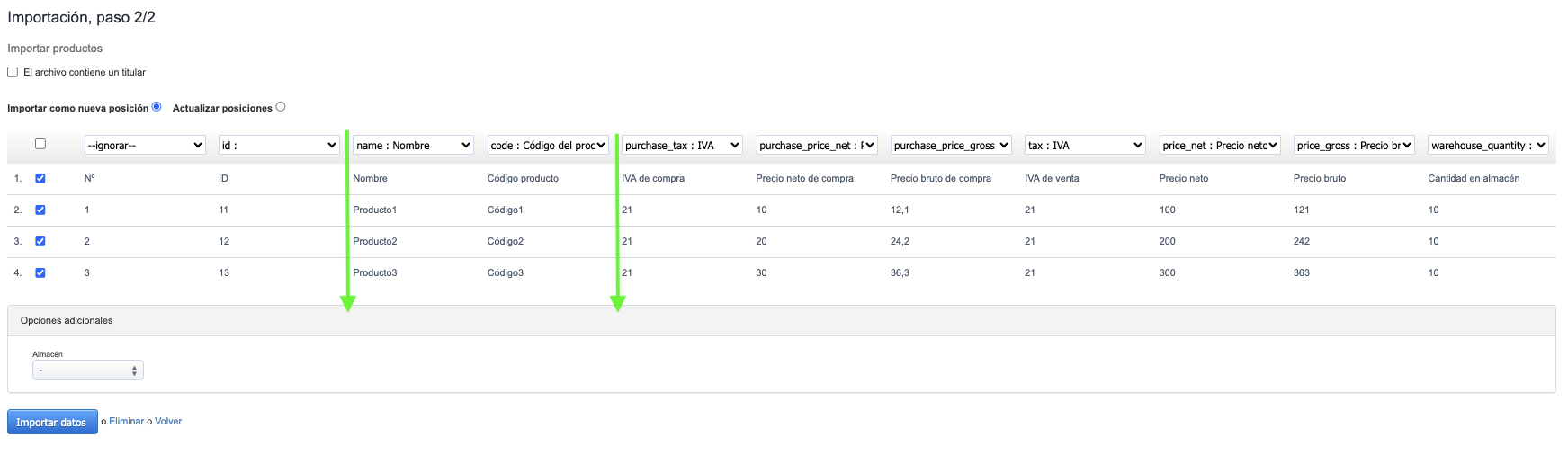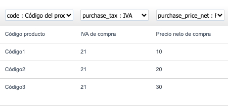¡NOTA! En el segundo paso de la importación de productos, puedes importar códigos de productos visibles en las partidas de la factura; simplemente asígnales a la columna correspondiente.