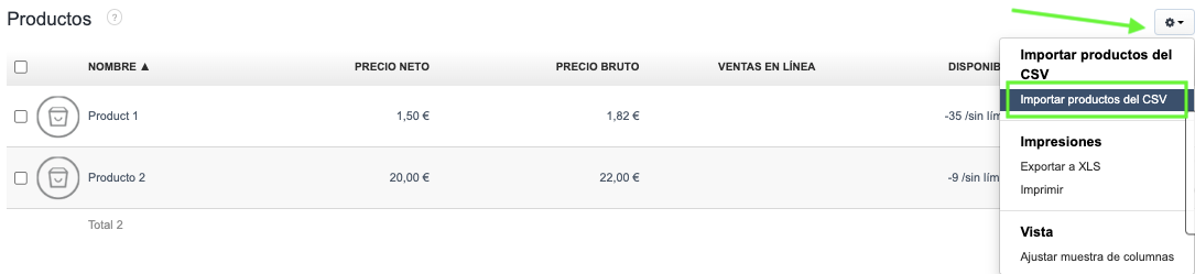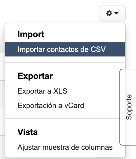 Para importar datos a BitFactura, ve al menú de Clientes (o Productos). En la esquina superior derecha encontrarás el botón de ajustes (el símbolo de engranaje). Utilízalo para desplegar la pestaña y seleccionar Importar contactos de CSV (o Importar productos del CSV).