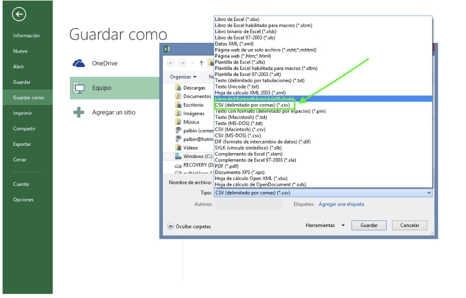 Un archivo CSV separado por comas se puede obtener exportando desde programas como EXCEL, OpenOffice o Google Docs de la siguiente manera: Amplía la pestaña Archivo, luego selecciona Guardar como. Ingresa un nombre de archivo. En el campo Tipo de archivo, elige la opción CSV (delimitado por comas).