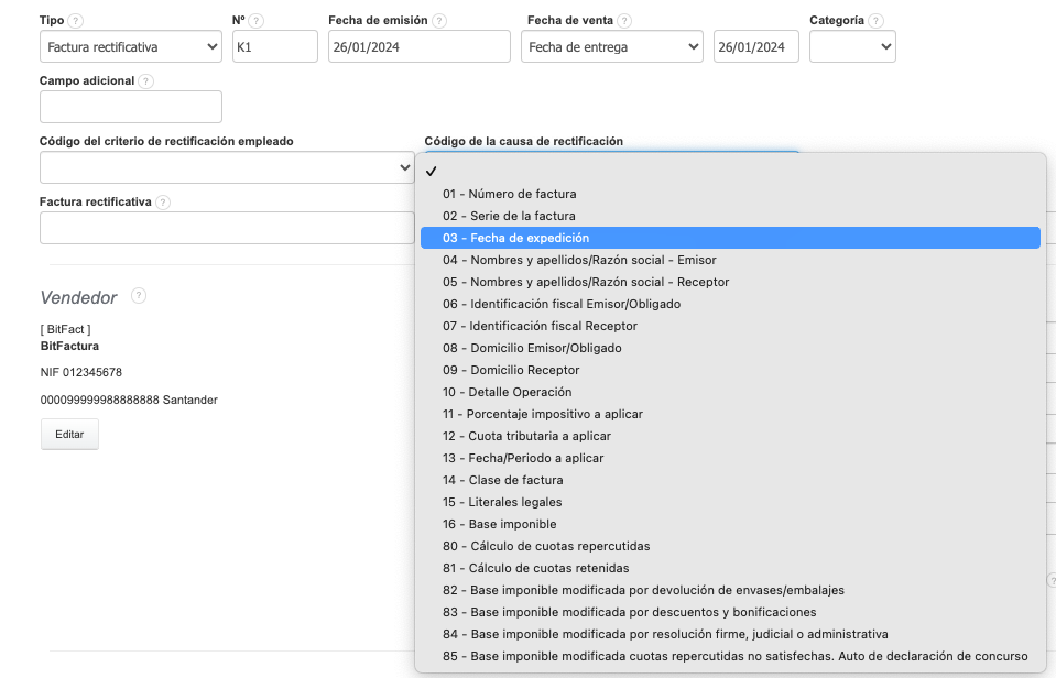 El código del motivo de rectificación se usa para los documentos en formato FacturaE. El numero adecuado proporciona la información sobre la causa de rectificación.